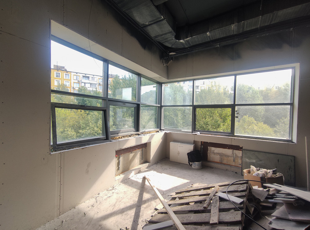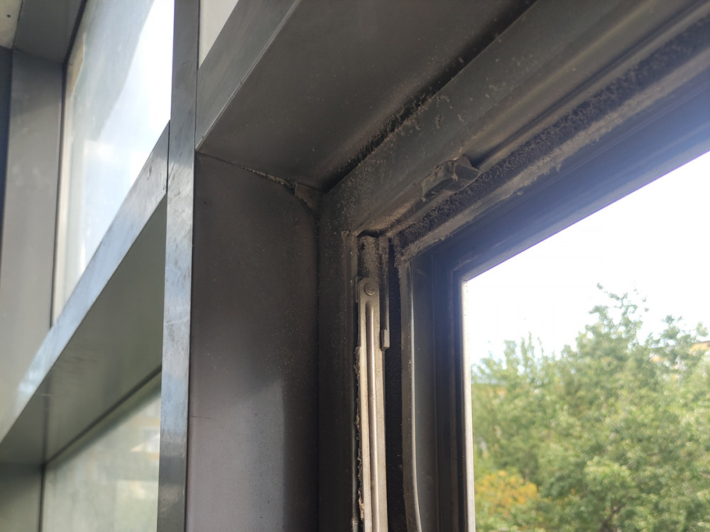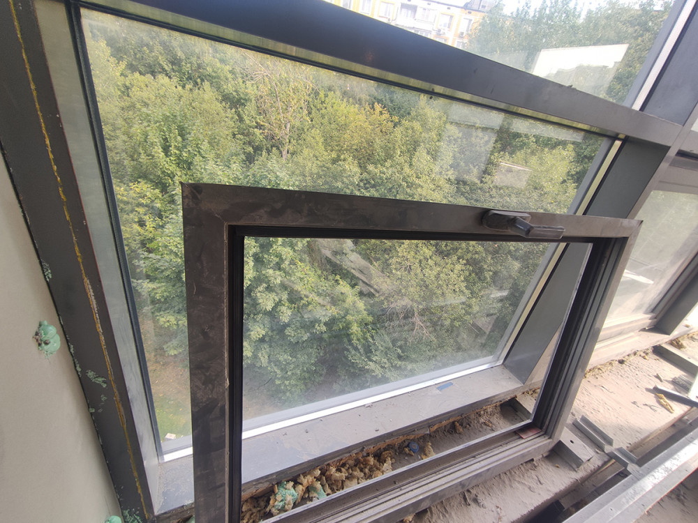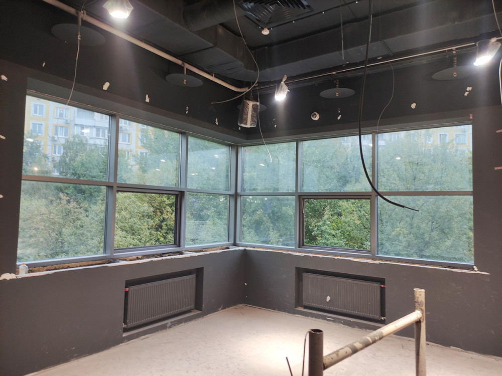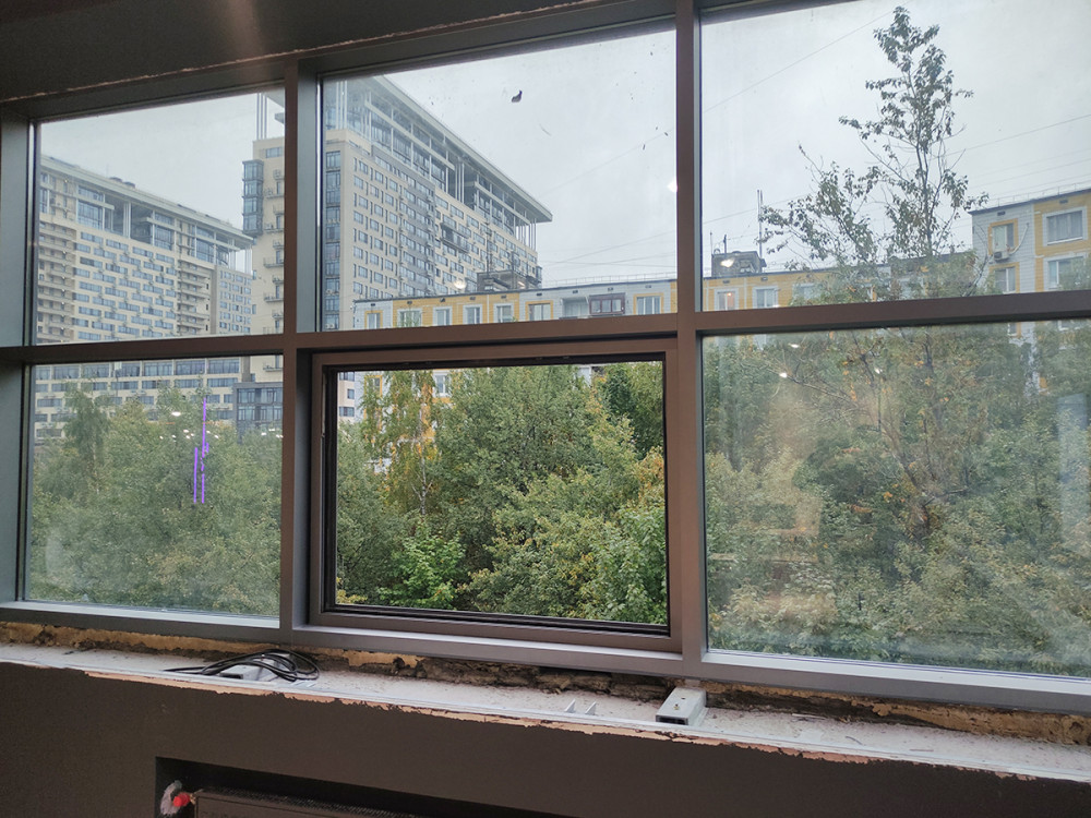 Дано: алюминиевые окна в помещении после ремонтно-строительных работ, ригельно-стоечная фасадная система.